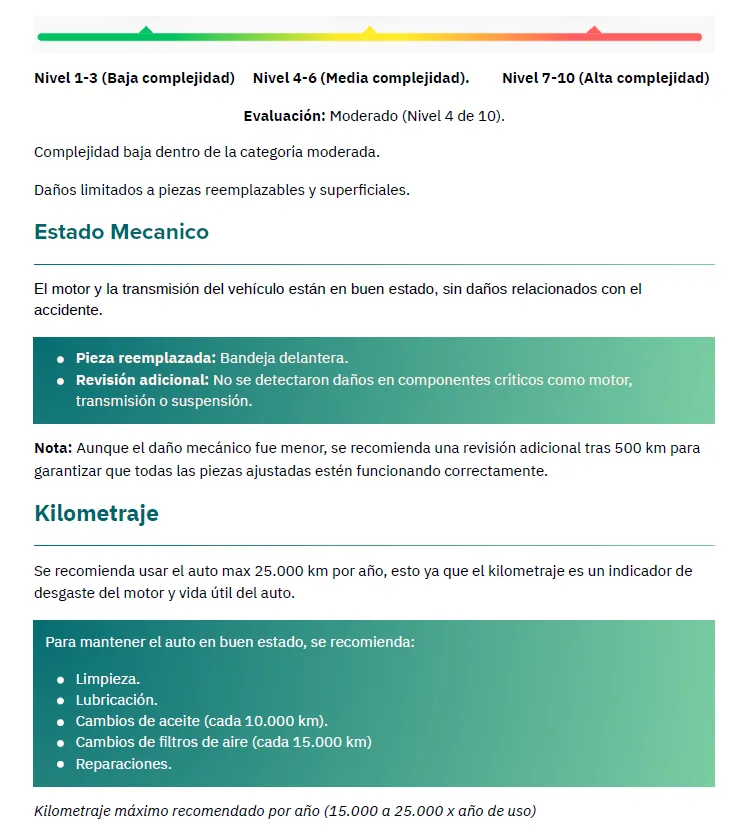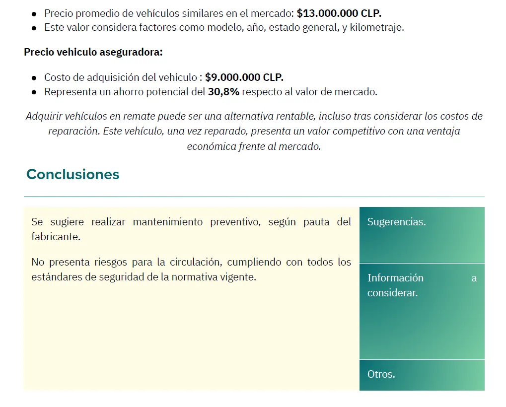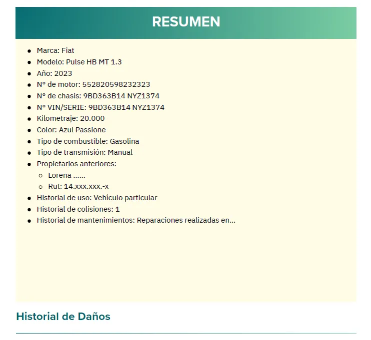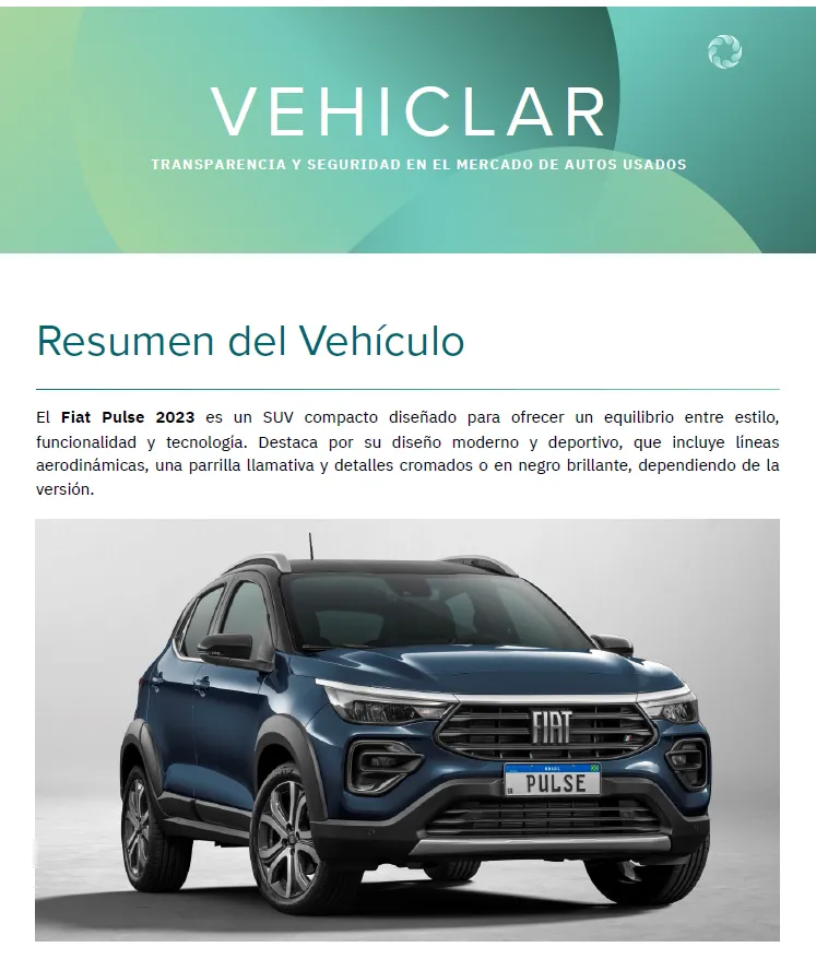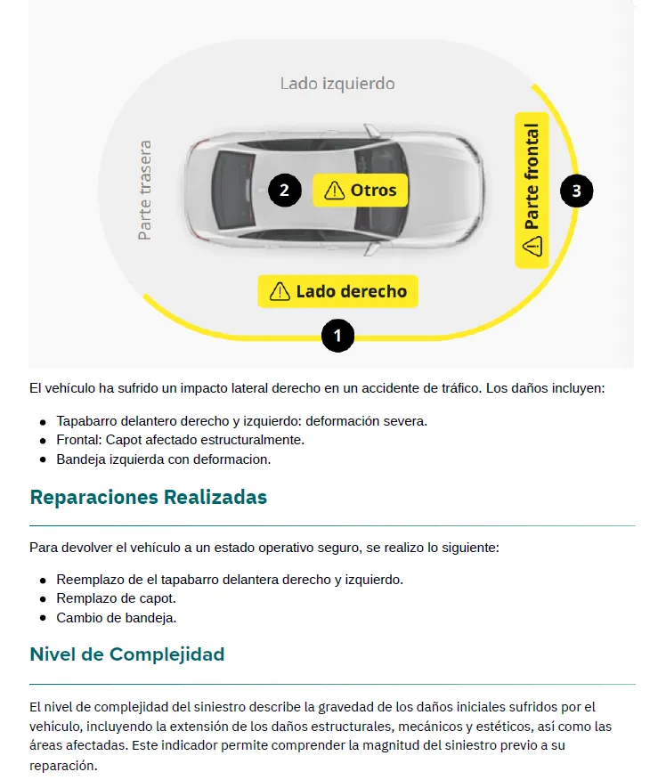 Vehiclar proporciona un informe exhaustivo del vehículo. En él, podrás encontrar detalles como el historial de daños, las reparaciones realizadas, el estado mecánico y estructural, así como cualquier otra información relevante que pueda influir en tu decisión de compra.